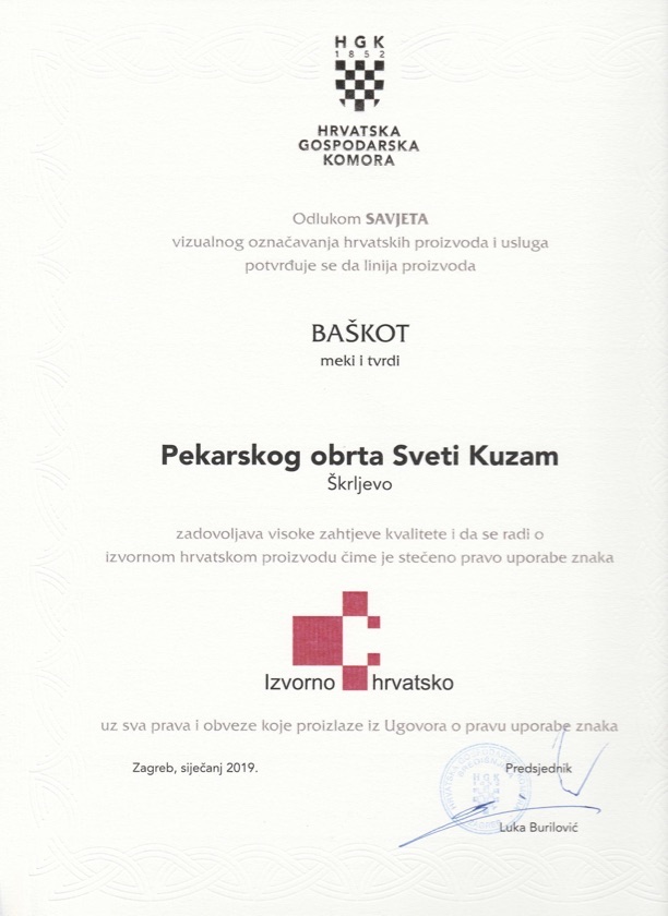 Da naš baškot, osim izvornosti i tradicije, zadovoljava i visoke zahtjeve kvalitete potvrdila je i Hrvatska gospodarska komora dodijelivši mu 2011. godine znak Izvorno hrvatsko koji s ponosom ističemo.